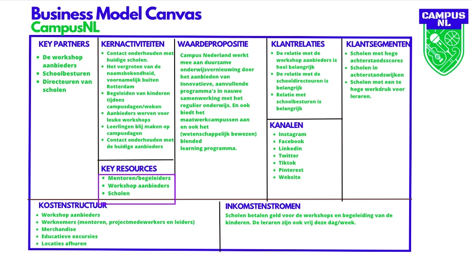 Om een strategisch overzicht te maken van Campus NL hebben wij een businessmodel canvas gemaakt (Hoekstra, 2021). Dit zal ons helpen bij het ontwikkelen van een efficiënte marktstrategie wanneer zij doen uitbreiden naar een andere stad waarbij de kernkwaliteiten en activiteiten centraal staan.