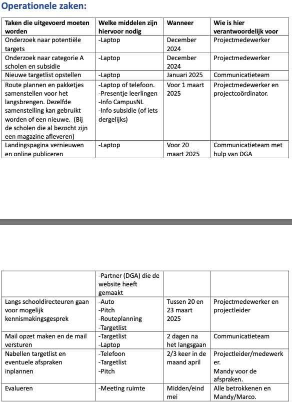 Vanuit deze scholen hebben wij een targetlist opgesteld met telefoonnummer, e-mailadres, BRIN- nummer, naam schooldirecteur en adres. Op basis van deze lijst hebben wij een route uit kunnen stippelen om langs te gaan bij de scholen. Vervolgens hebben wij een pakket samengesteld met een presentje voor de leerlingen (voetbal met CampusNL logo), de brand bible van CampusNL en een informatiekaartje over de subsidie school & omgeving. Dit pakket was in de groene kleur (huisstijl CampusNL) met een sticker op de doos van het logo van CampusNL.